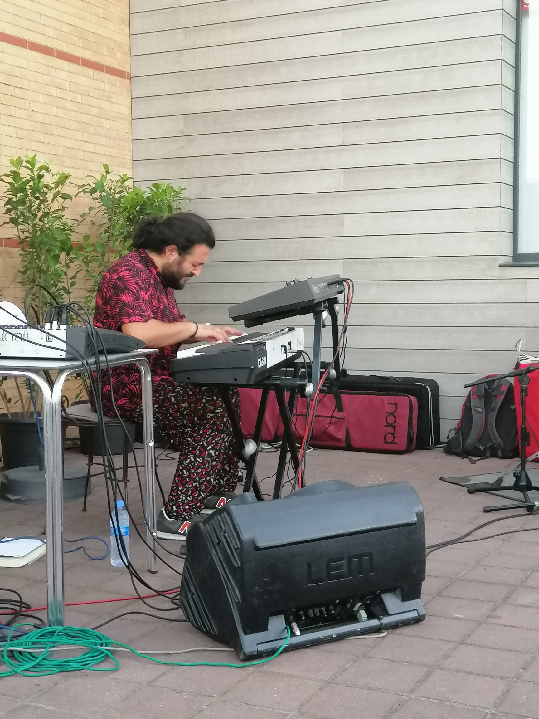 El pasado Viernes 11 de Junio tuvo lugar en la sede de nuestra Asociación un espectacular concierto de Jazz a cargo del pianista onubense Juan Pérez, al que le acompañó el percusionista, también onubense, de Moguer para más señas, Lito Manez. Los asistentes tuvimos la oportunidad de disfrutar una emocionante velada en la que destacaba la fuerza y el ímpetu en las interpretaciones, con el sello característico de Juan Pérez, fusionando el flamenco con el jazz en algunos de sus temas y sin obviar la perfecta sintonía con el batería “Lito”. Ambos músicos se complementaron a la perfección, y esa complicidad se pudo trasladar a los asistentes, provocando momentos de especial emoción.