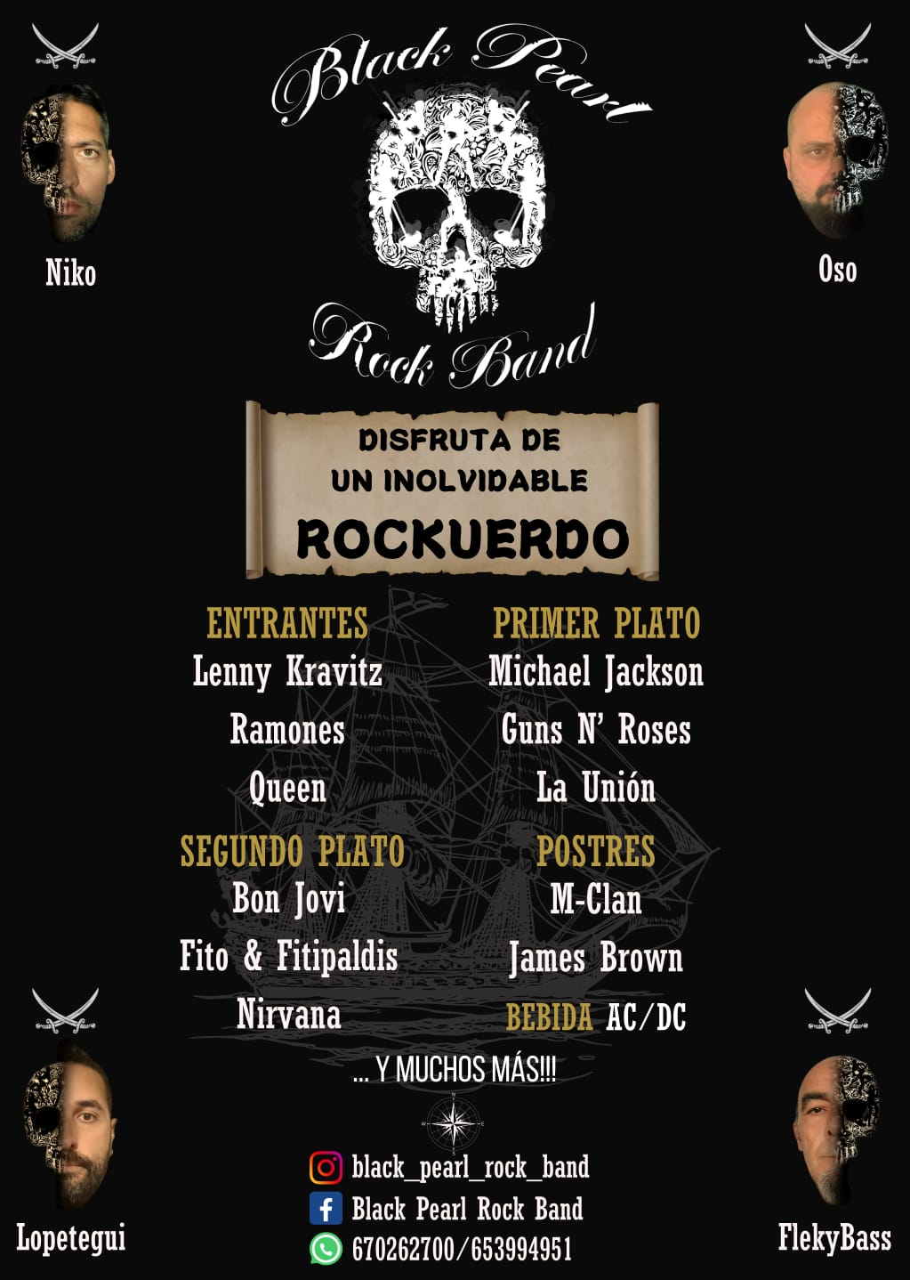 Sábado 25 de Mayo’24 a las 20,30h. tendrá lugar, en la sede de nuestra asociación, el concierto de Rock donde el grupo Black Pearl interpretarán hits musicales de los años 80’s, 90’s y 2000’s, Ellos se definen como un grupo de cuatro piratas de Punta Umbría portadores del mejor Rock que surcan las aguas de Huelva con interpretando a grandes artistas, como Lenny Kravitz, Ramones, Queen, Bon Jovi, Fito y Fitipaldis, Guns N’Roses, AC/DC los cuales te harán disfrutar de un inolvidable ROCKUERDO