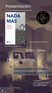 Estimados socios y amigos, el próximo Jueves, 26 de Septiembre, a las 19.30h. tendrá lugar, en la Sede de nuestra Asociación, la presentación del libro ” NADA MAS” del autor